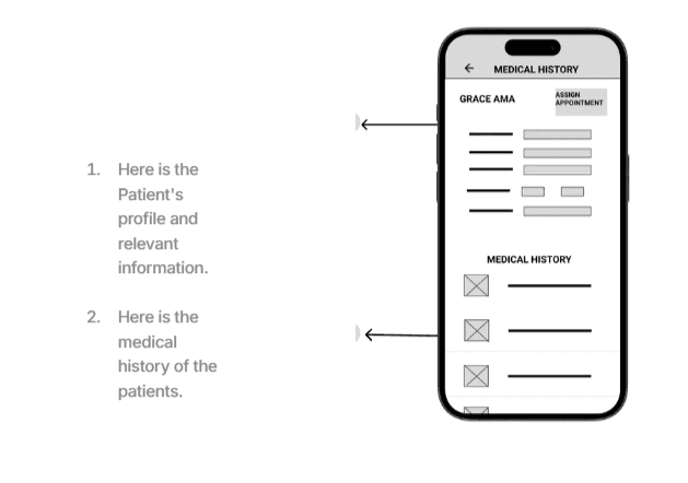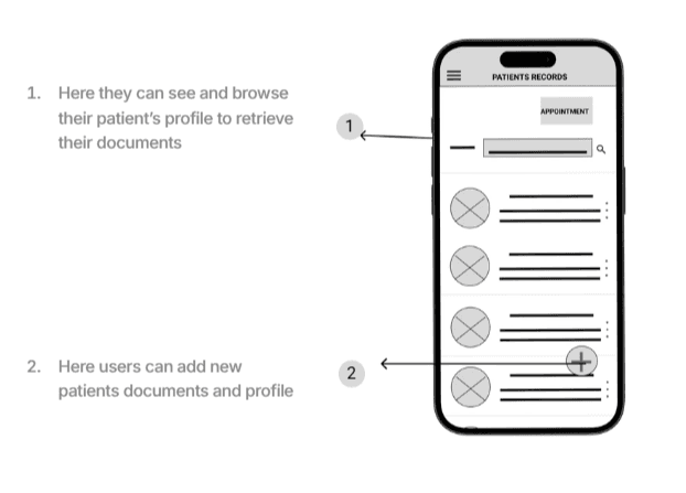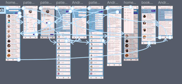 The User flow for this prototype starting from home page users can browse through or use the search bar to look for a patient's’ profile, navigate to the patient's medical history and also add new patients or update the information of an already existing profile. From the homepage also users check assigned appointments or make new ones. Please check out the prototype here