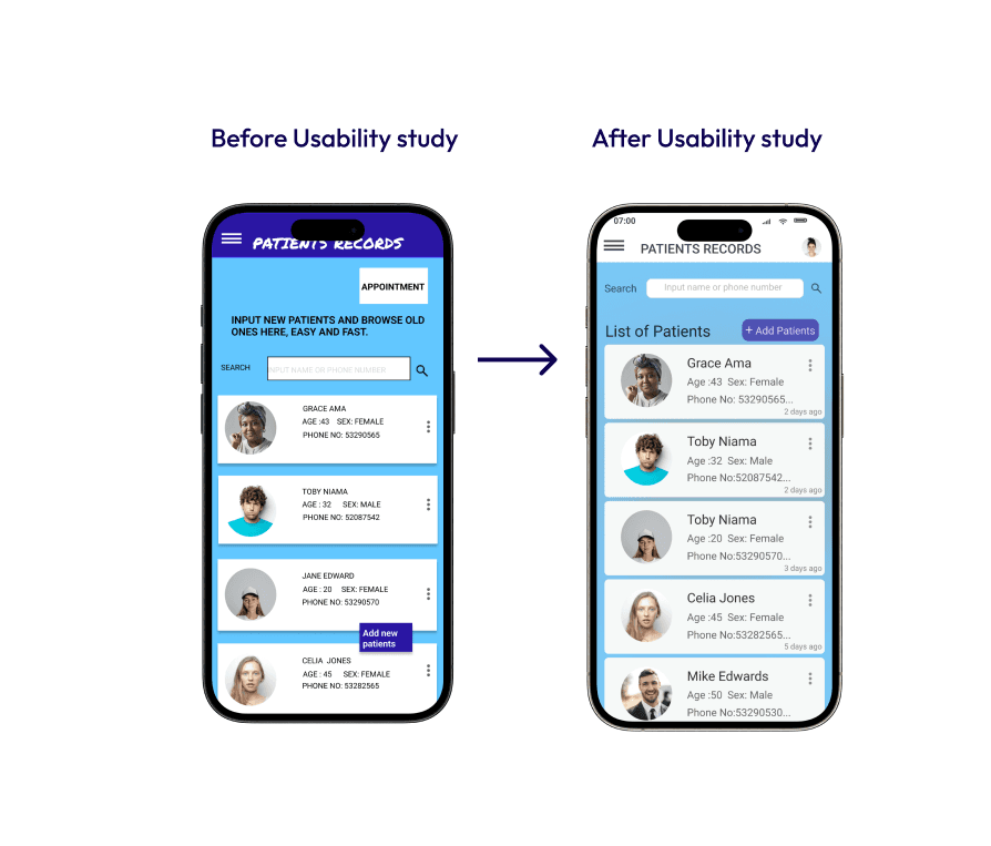 The second usability study shows that users want a better cue to able to view more about the patient and to know when the patients profile was created so i added the that and a better new patients button to help users navigate to see more about the patient.